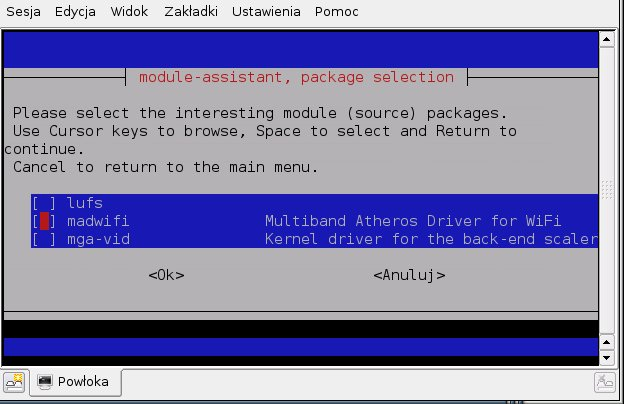 Przed rozpoczęciem konfiguracji należy upewnić się, czy spełnione są wymagania wyspecyfikowane na tej stronie: http://eduroam.amu.edu.pl/zasady.html - w szczególności wymagania dotyczące hasła. Przed rozpoczęciem konfiguracji należy zainstalować sterowniki do posiadanej karty bezprzewodowej. Niniejszy opis dotyczy karty bezprzewodowej opartej na układzie Atheros (sterowniki madwifi). Jeżeli nie wiemy jakiego układu używa nasza karta, warto posłużyć się poleceniami lspci lub lsusb. Do przeszukiwania listy pakietów można posłużyć się narzędziem module-assistant, którego instalujemy poleceniem apt-get install module-assistant i uruchamiamy poleceniem module-assistant. |