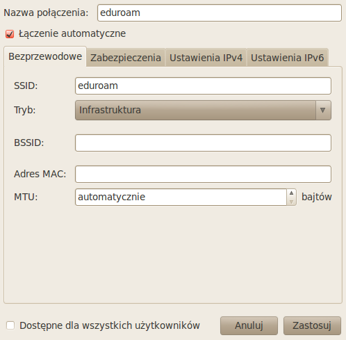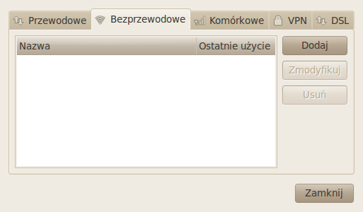 Następnie potwierdzamy przyciskiem Zastosuj wykonaną wcześniej konfigurację. Okno Połączenia sieciowe zakładka Bezprzewodowe powinno wyglądać tak jak poniżej: |