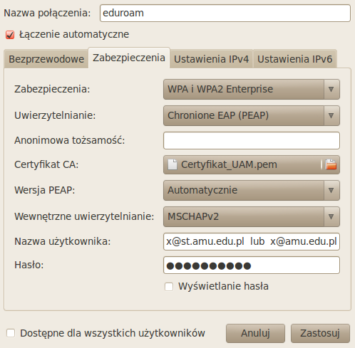 W następnym kroku należy wybrać zakładkę Zabezpieczenia i wypełnić zgodnie z rysunkiem poniżej. Nazwą użytkownika jest adres mailowy login@st.amu.edu.pl dla studentów lub login@amu.edu.pl dla pracowników. W zakładce Certyfikat CA wskazujemy na plik wcześniej zapisanego certyfikatu. |
