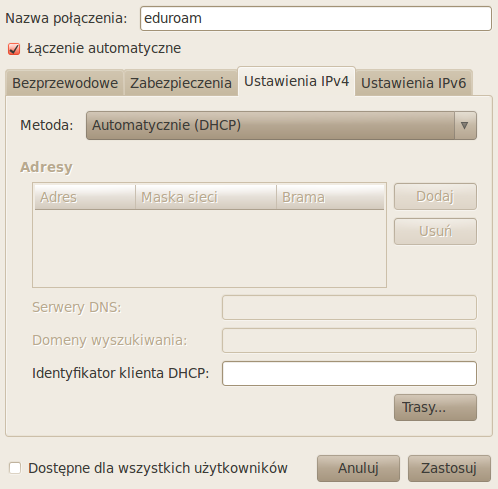 Przed rozpoczęciem konfiguracji należy upewnić się, czy spełnione są wymagania wyspecyfikowane na stronie: http://eduroam.amu.edu.pl/zasady.html - w szczególności wymagania dotyczące hasła. Konfigurację należy rozpocząć od pobrania i zapisania na dysku w wybranym przez siebie miejscu elektronicznego certyfikatu, który ma chronić komputer przed przypadkowym łączeniem się z fałszywymi punktami dostępu bezprzewodowego. Dlatego ważne jest, aby pobrać certyfikat bezpośrednio ze strony webowej UAM pod adresem eduroam.amu.edu.pl w dziale Certyfikaty. UWAGA! Nie należy instalować certyfikatu otrzymanego od innych osób lub pochodzącego z innych źródeł! W celu rozpoczęcia konfiguracji należy wybrać odpowiednio System-->Preferencje-->Połączenia sieciowe. Otwarte okno powinno wyglądać tak: |
