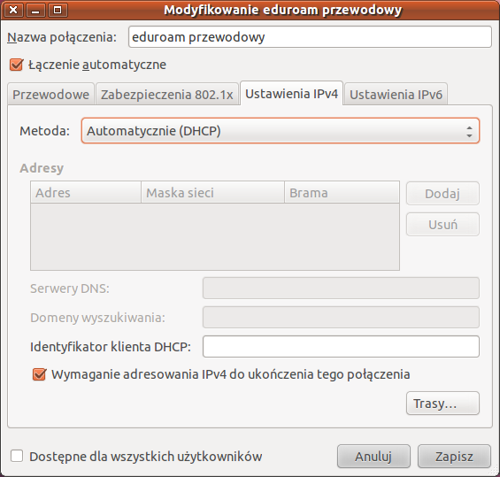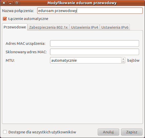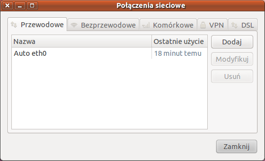 Następnie potwierdzamy przyciskiem Zapisz wykonaną wcześniej konfigurację. Okno Połączenia sieciowe zakładka Przewodowe powinno wyglądać tak jak poniżej: |