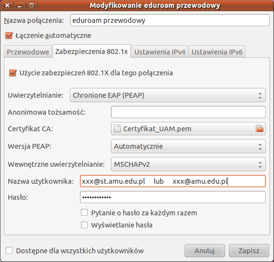 W następnym kroku należy wybrać zakładkę Zabezpieczenia i wypełnić zgodnie z rysunkiem poniżej. Nazwą użytkownika jest adres mailowy login@st.amu.edu.pl dla studentów lub login@amu.edu.pl dla pracowników. W zakładce Certyfikat CA wskazujemy na plik wcześniej zapisanego certyfikatu. |