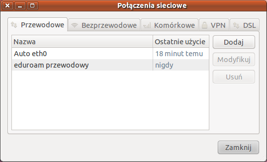 Proszę zamknąć okno. Połączenie z Eduroam powinno nastąpić automatycznie. Gdyby jednak tak się nie stało to w Obszarze powiadomień należy kliknąć lewym przyciskiem myszy na ikonkę NetworkManagera i uruchomić Eduroam ręcznie. |