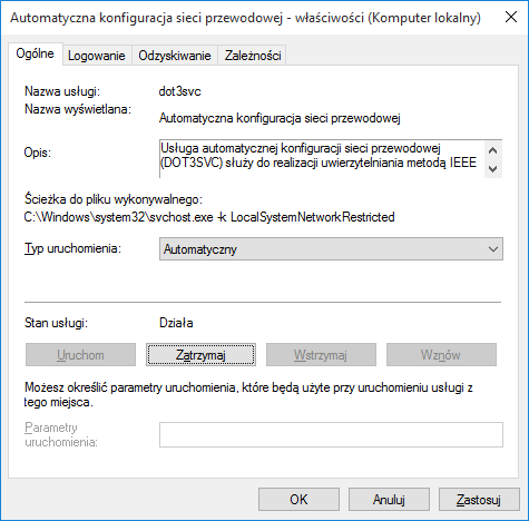 Kliknąć prawym przyciskiem myszy na opcji Automatyczna konfiguracja sieci przewodowej i wybrać Właściwości |