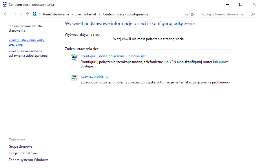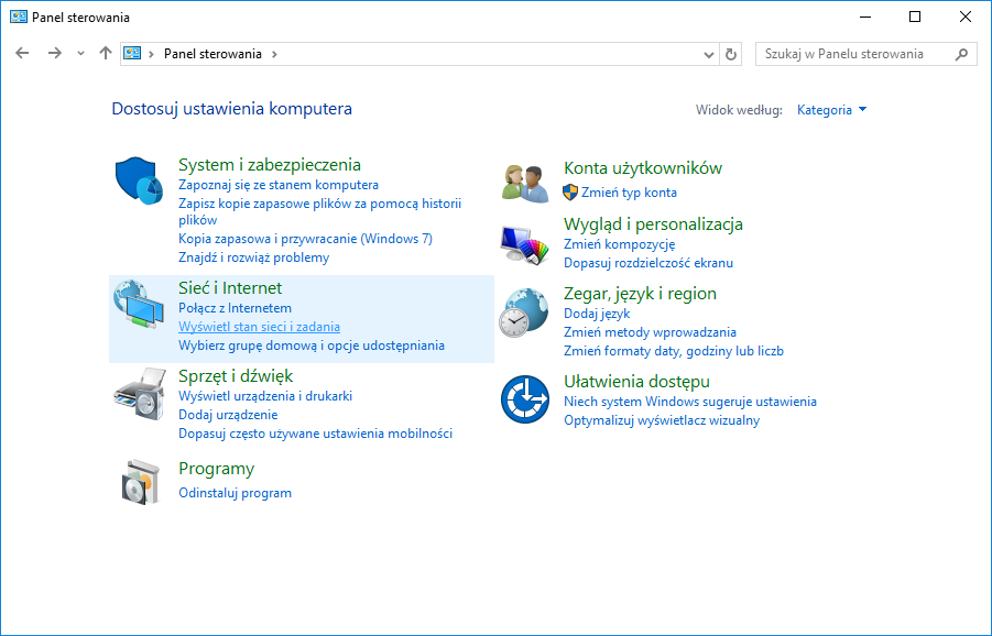 W Panelu Sterowania wybrać Sieć i Internet -> Wyświetl stan i zadania |