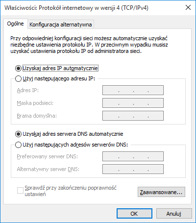 Zaznaczyć Protokół internetowy w wersji 4 i wybrać Właściwości |