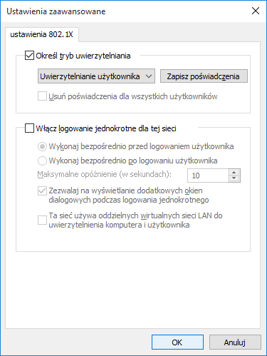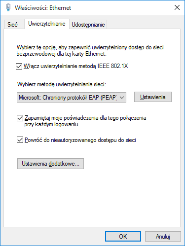 Przejść do zakładki Uwierzytelnianie i ustawić według rysunku poniżej a następnie nacisnąć Ustawienia |