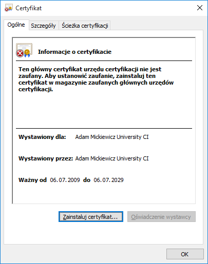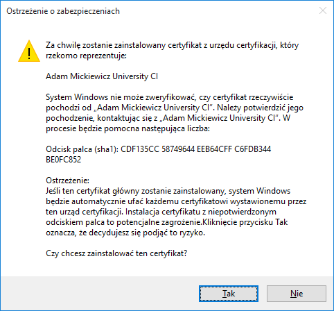 Aby rozpocząć instalację certyfikatu należy otworzyć pobrany wcześniej plik ze strony eduroam.amu.edu.pl. Po wykonaniu tej operacji powinno ukazać się następujące okno: |