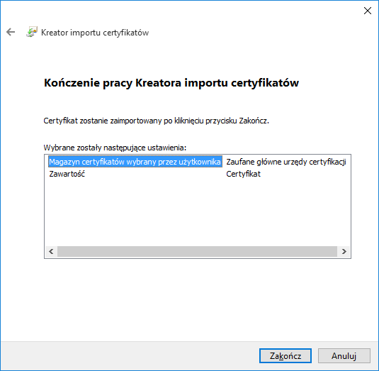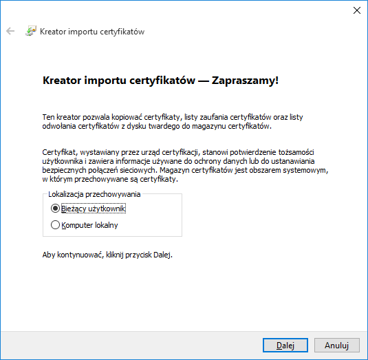 Następnie należy wybrać przycisk Zainstaluj certyfikat > Po tej operacji powinno pojawić się następujące okno: |