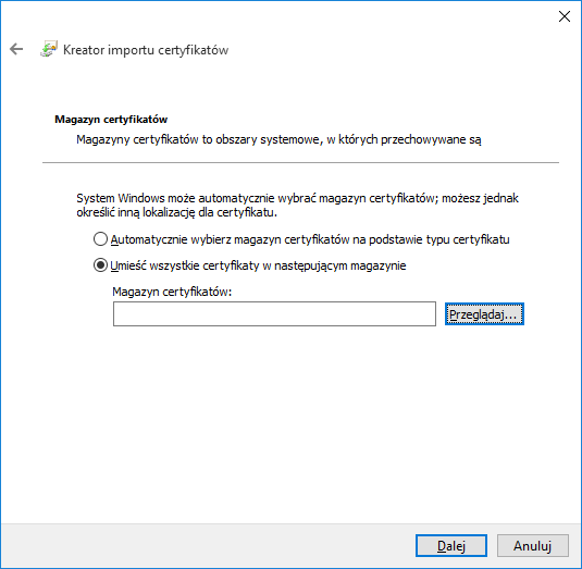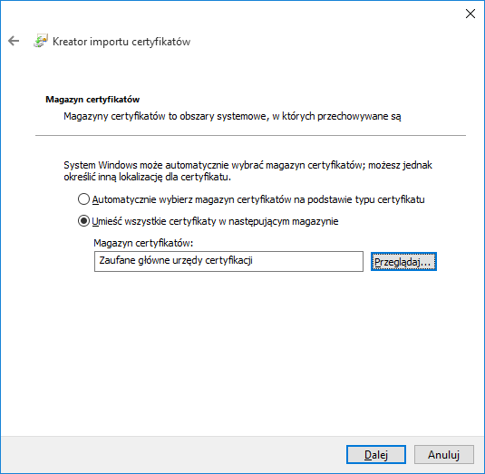 W otwartym oknie należy zaznaczyć opcję Umieść wszystkie certyfikaty w następującym magazynie i następnie wybrać przycisk Przeglądaj... Po tej operacji powinno pojawić się okno, w którym należy wybrać magazyn Zaufane główne urzedy certyfikacji |