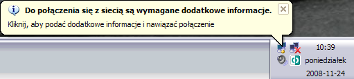 Następnie należy potwierdzić przyciskiem OK wszystkie otwarte okna. Połączyć kablem sieciowym zakończonym wtykami RJ45 komputer z gniazdem. Po wykonaniu tej operacji powinien pojawić się następujący dymek w prawym dolnym rogu ekranu: |