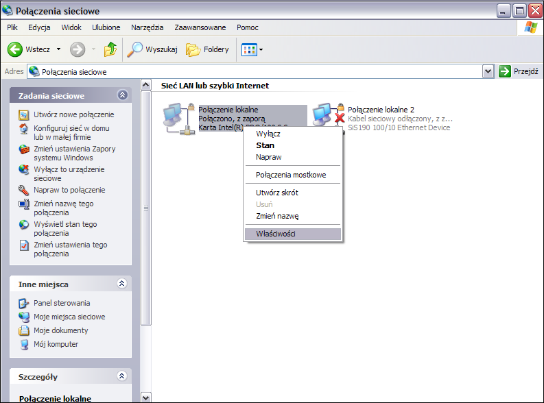Następnie należy kliknąć prawym przyciskiem myszy na Połączeniu lokalnym i wybrać Właściwości. |