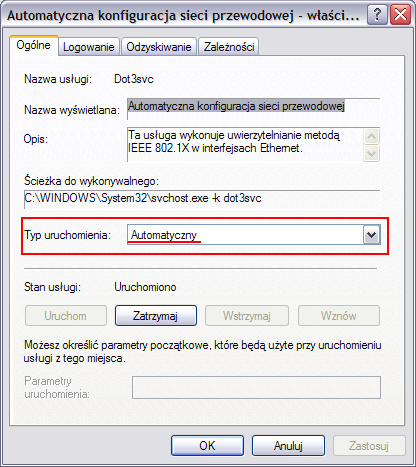 Następnie należy wybrać opcję Tryb uruchamiania -> Automatyczny i wybrać przycisk Zastosuj, a następnie OK. |