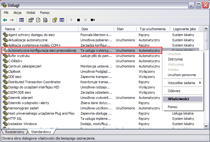Następnie należy kliknąć prawym przyciskiem myszy na opcję Automatyczna konfiguracj sieci przewodowej i wybrać Właściwości. |